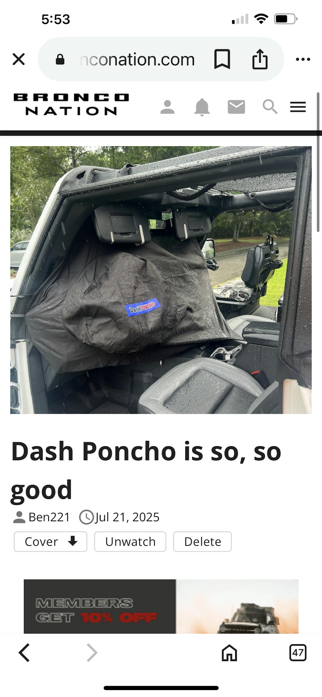 While at work, and I checked the weather multiple times, I had to quick run out during a short down pour. Sure the interior got wet with no doors and no top but it could have been much worse! Jeep dried out and was fine. Thx poncho! It was the first time I used it and literally took me no time to put it on